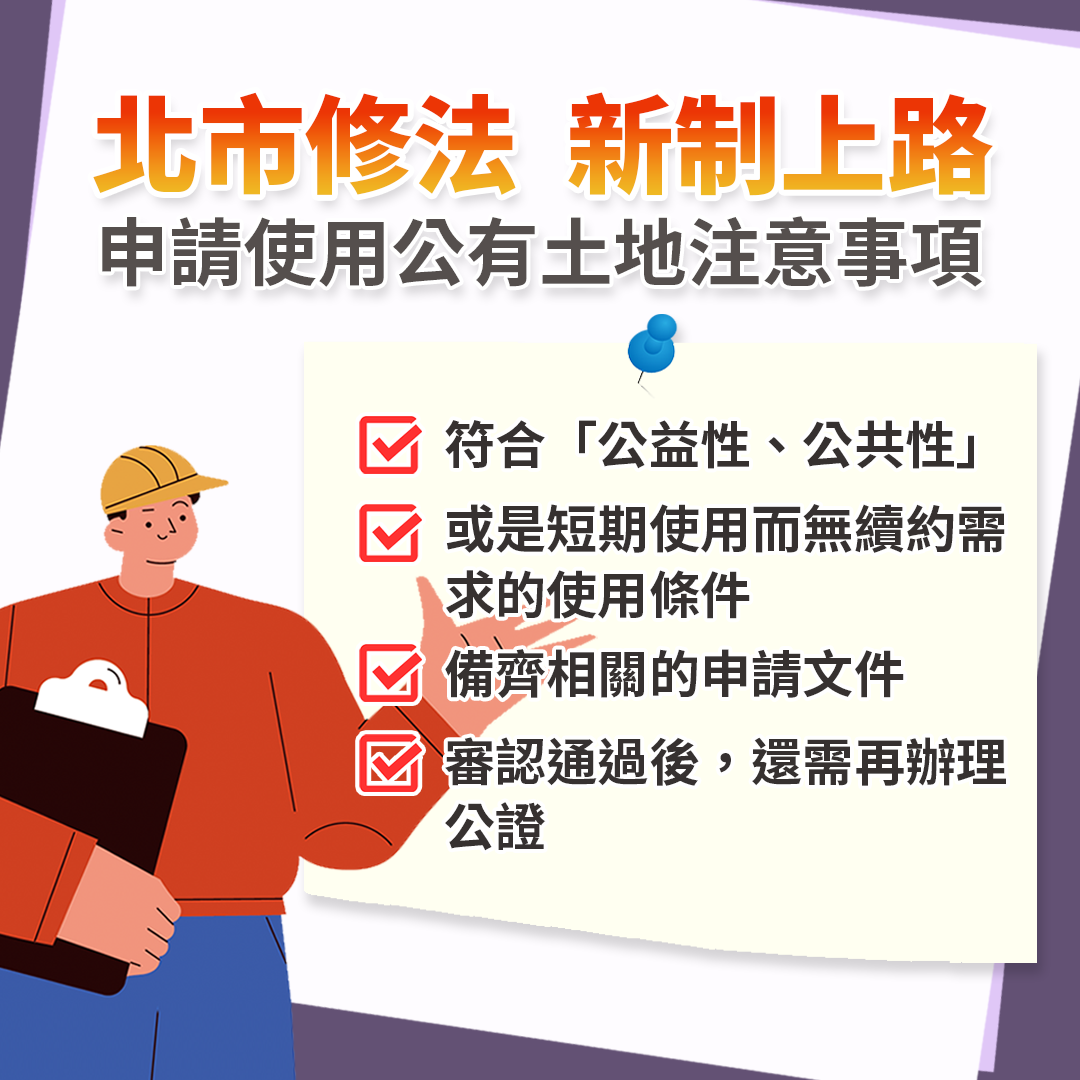 北市水利處今天表示,因法規修正,提醒民眾要多留意,現在向市府申請使用公有土地,比起以往的程序,還多了一個步驟需要辦理公證,民眾申請前要了解相關程序,才能確保自己的權益。 水利處雨水下水道管理科指出,臺北市轄區範圍內有不少由水利處管理的市有土地,就座落於民眾日常生活可接觸到的環境周邊。以往針對這些市有土地的民眾申請案,若具公益性、公共性或是短期使用而無續約需求,水利處則依「臺北市市有公用房地提供使用辦法」辦理審認。 下管科說明,針對使用公有土地,因北市財政局考量其訂定的內容在實質上多數屬於私法契約,因此比照國有公用不動產出租的契約性質,以簽訂私法契約為原則,將自治規則之名稱修正為「臺北市市有公用不動產提供使用辦法」,增加應辦理公證事宜(含共同負擔費用)相關規定,今年2月1日起,新申請案件已開始適用新制規定。 新法規已經上路,為避免增加申請的期程,水利處特別提醒民眾,申請公有土地前,一定要先了解相關適用條件,也就是要符合公益性、公共性,或是短期使用而無續約需求的使用條件,也要備齊相關的申請文件,而且審認通過後,還要再辦理公證,才能在申請過程中確保自身的權益。